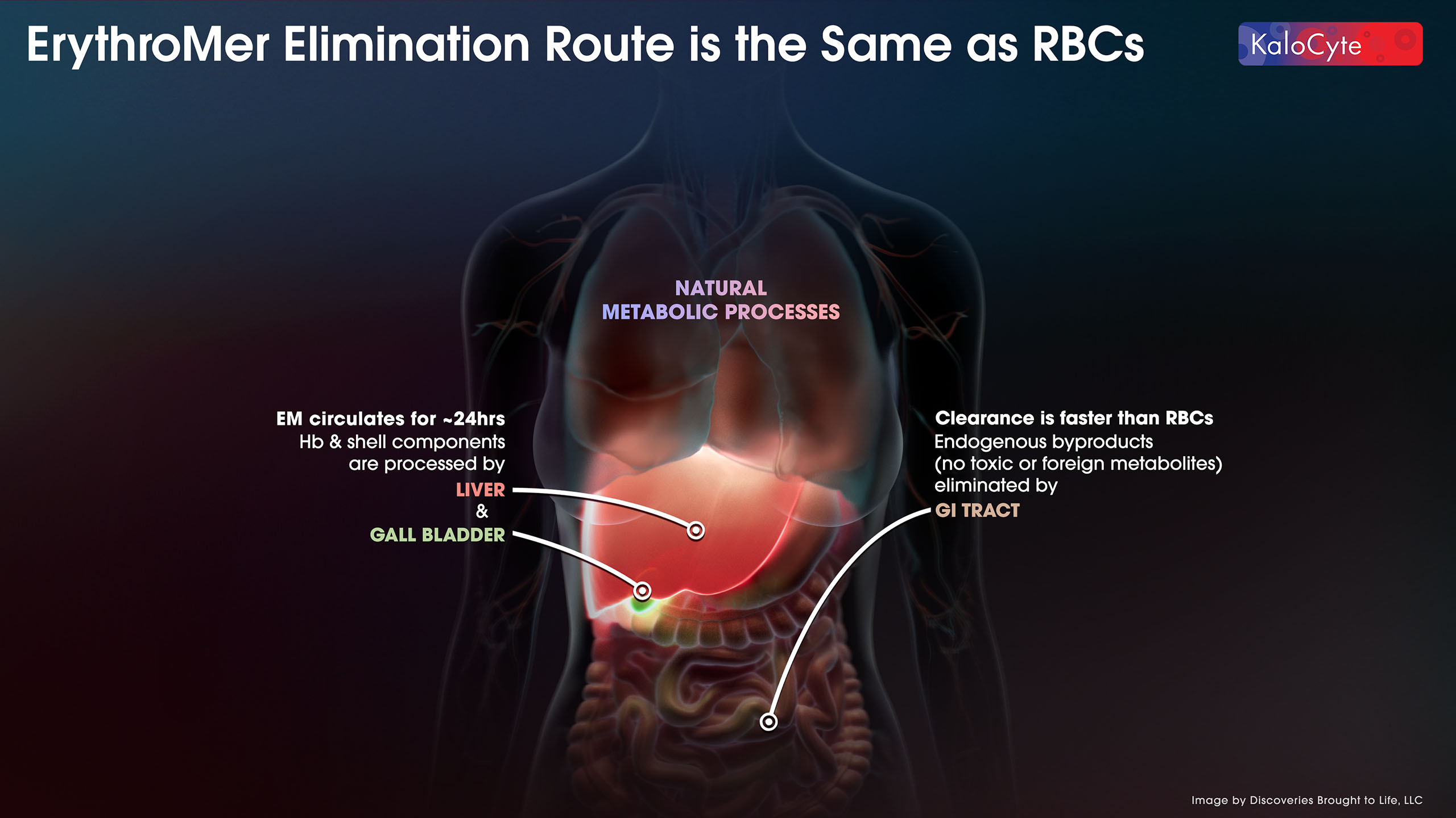 Based on our current preclinical studies, the current ErythroMer™ design in development will be effective for about 24 hours between doses and cleared just like native cells, with all natural byproducts. Hb and shell components are processed by the liver and gall bladder. Endogenous byproducts are eliminated by the GI tract.