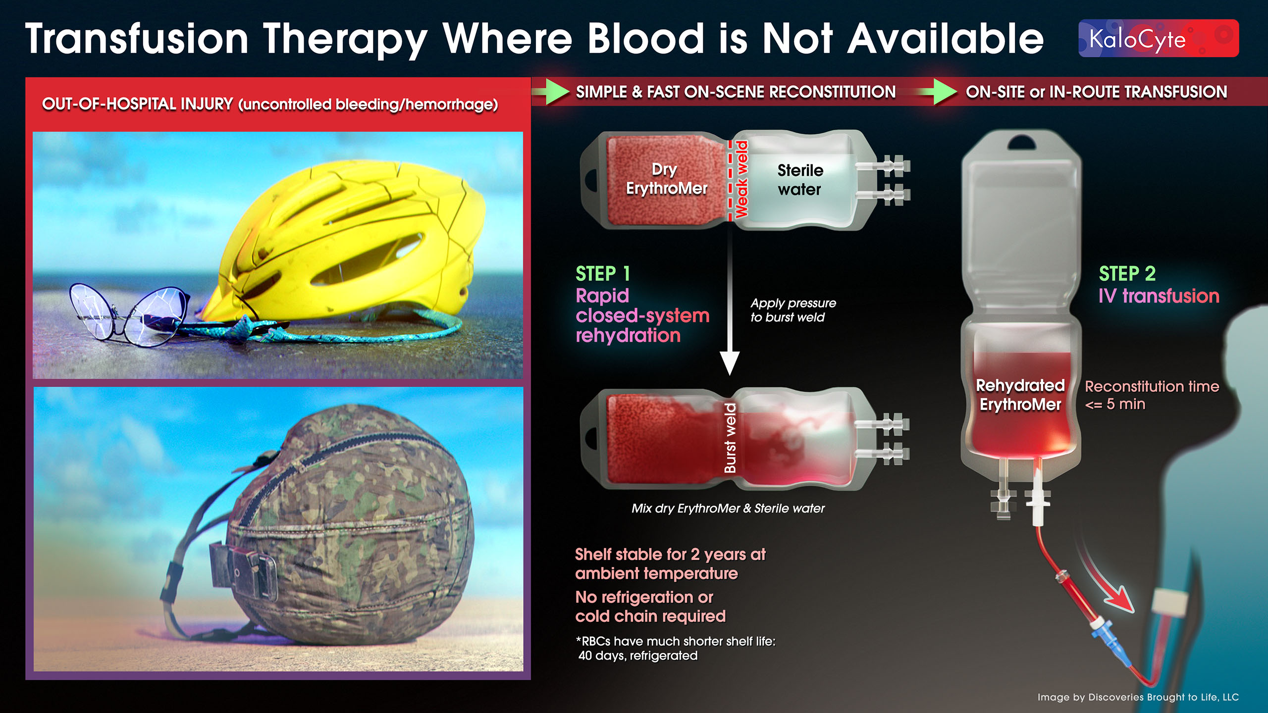 Blood loss after injury is responsible for over 25,000 lost lives each year in the US alone1, and billions of dollars in medical care and lost productivity. Every minute of delay in replacing lost blood increases mortality by 5%2, yet 47 million Americans live more than an hour from a trauma center3, and most ambulances do not carry blood. Once approved, ErythroMer™ will be supplied in a dual-chamber IV bag with dried powder and sterile water, shelf-stable without refrigeration, and packaged as a unit equivalent to one unit of red blood cells – “simply break the seal and mix” for rapid use at the point of care or on the way to the hospital.